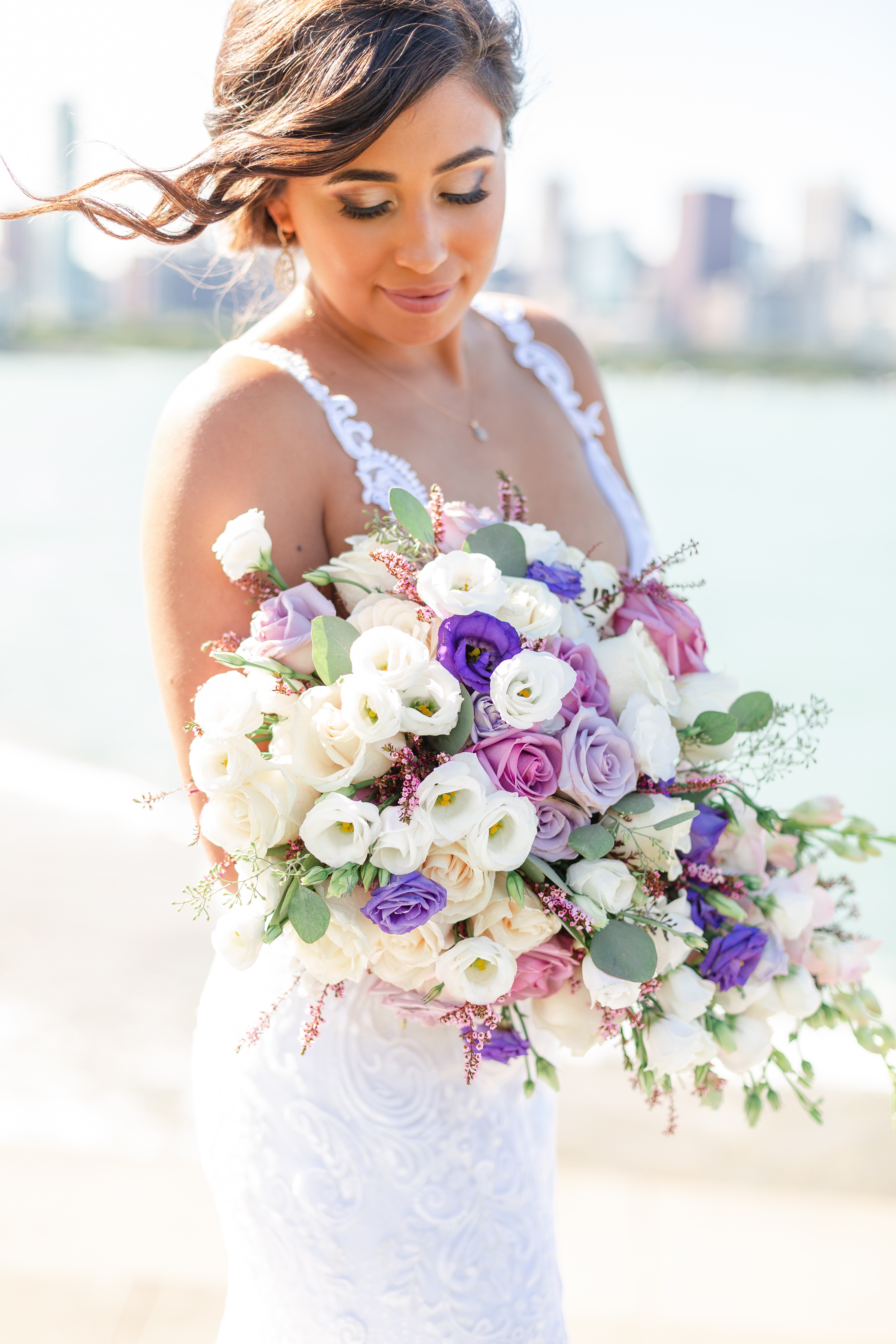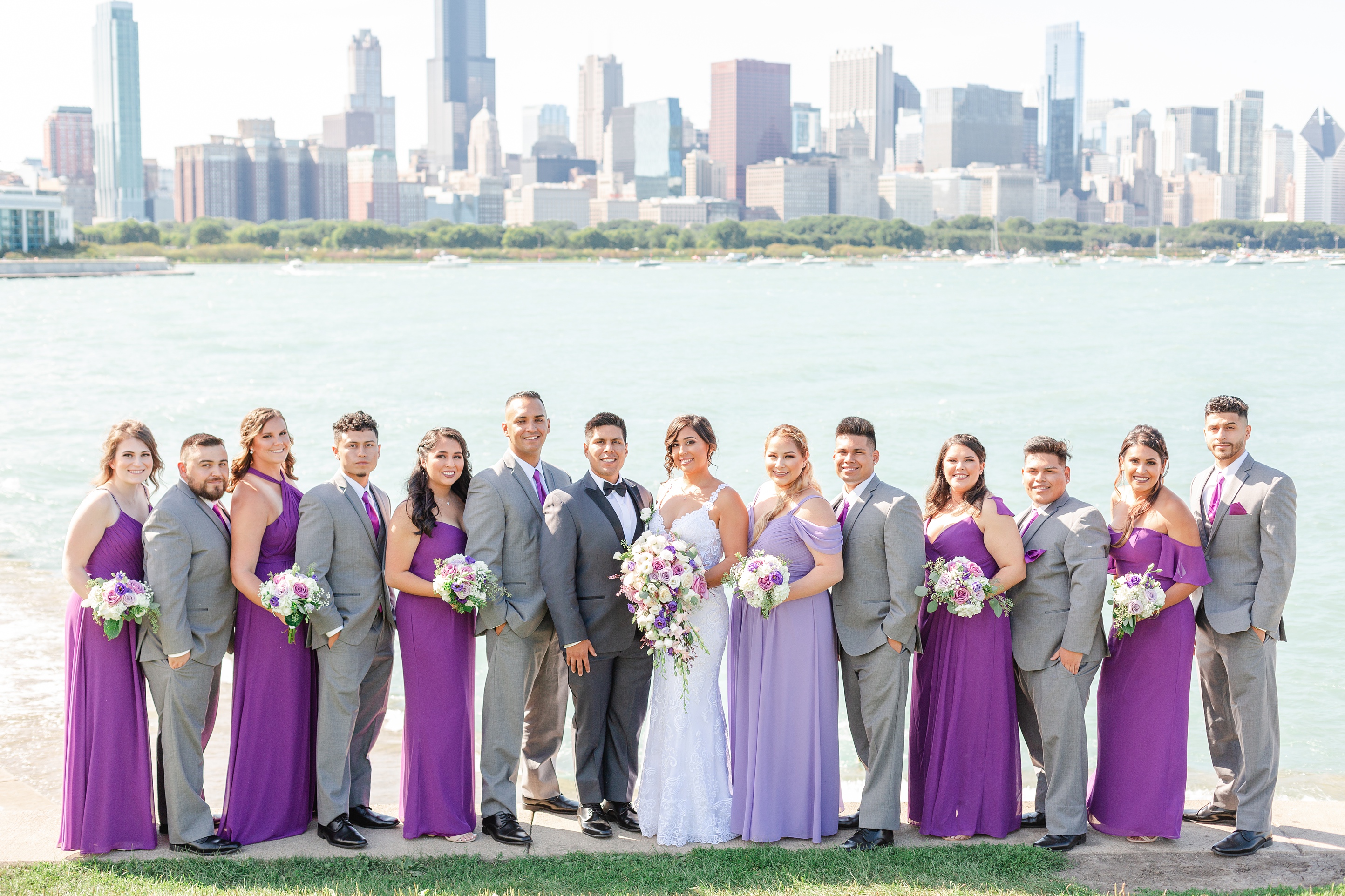 For Raquel & Dian’s wedding, we cruised downtown to take museum campus wedding photos with the perfect view of the skyline. The sun was out and the sky was beautiful. The lake was beautiful aqua and the skyline was painted in sunshine! It was an absolutely gorgeous day to get married.
