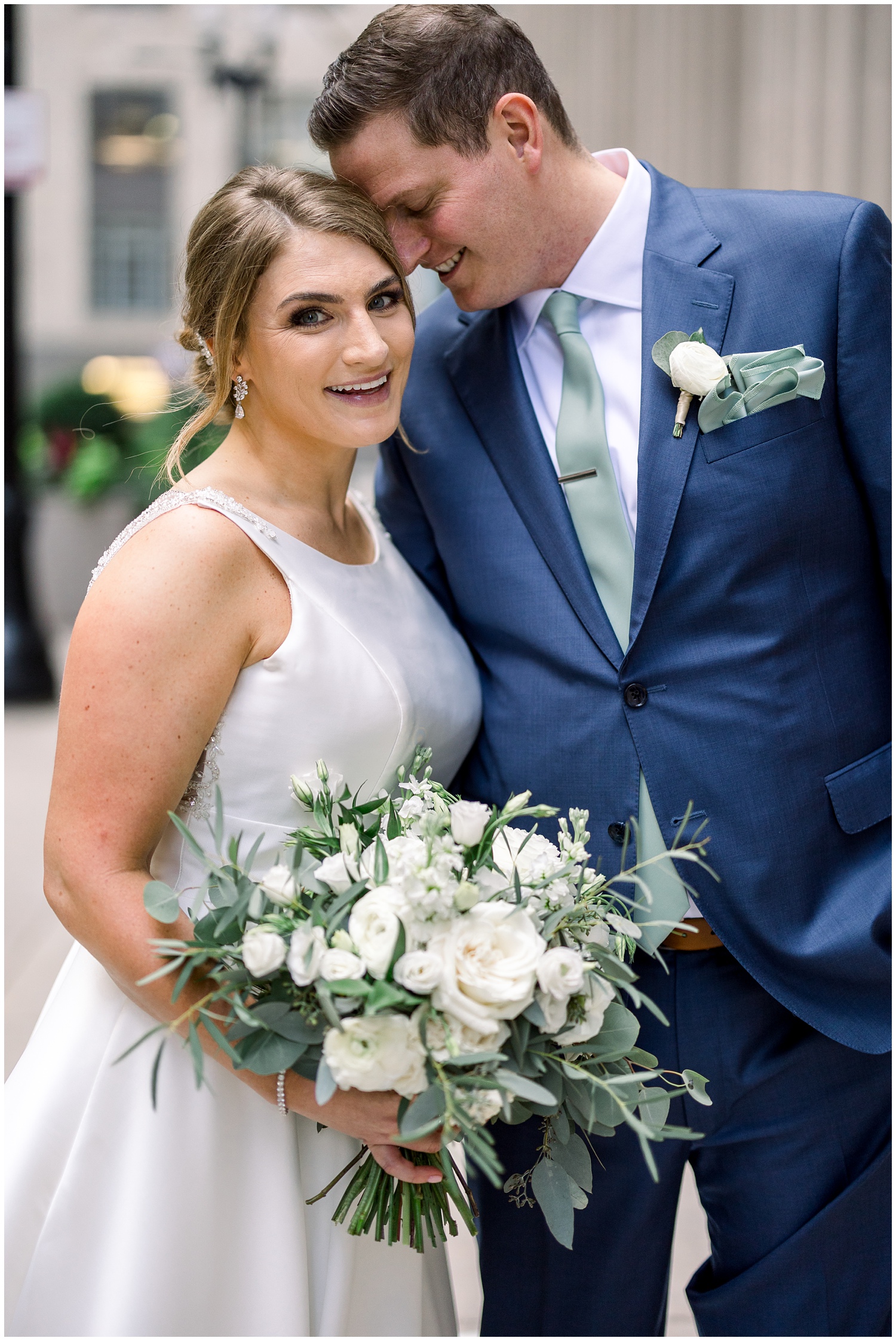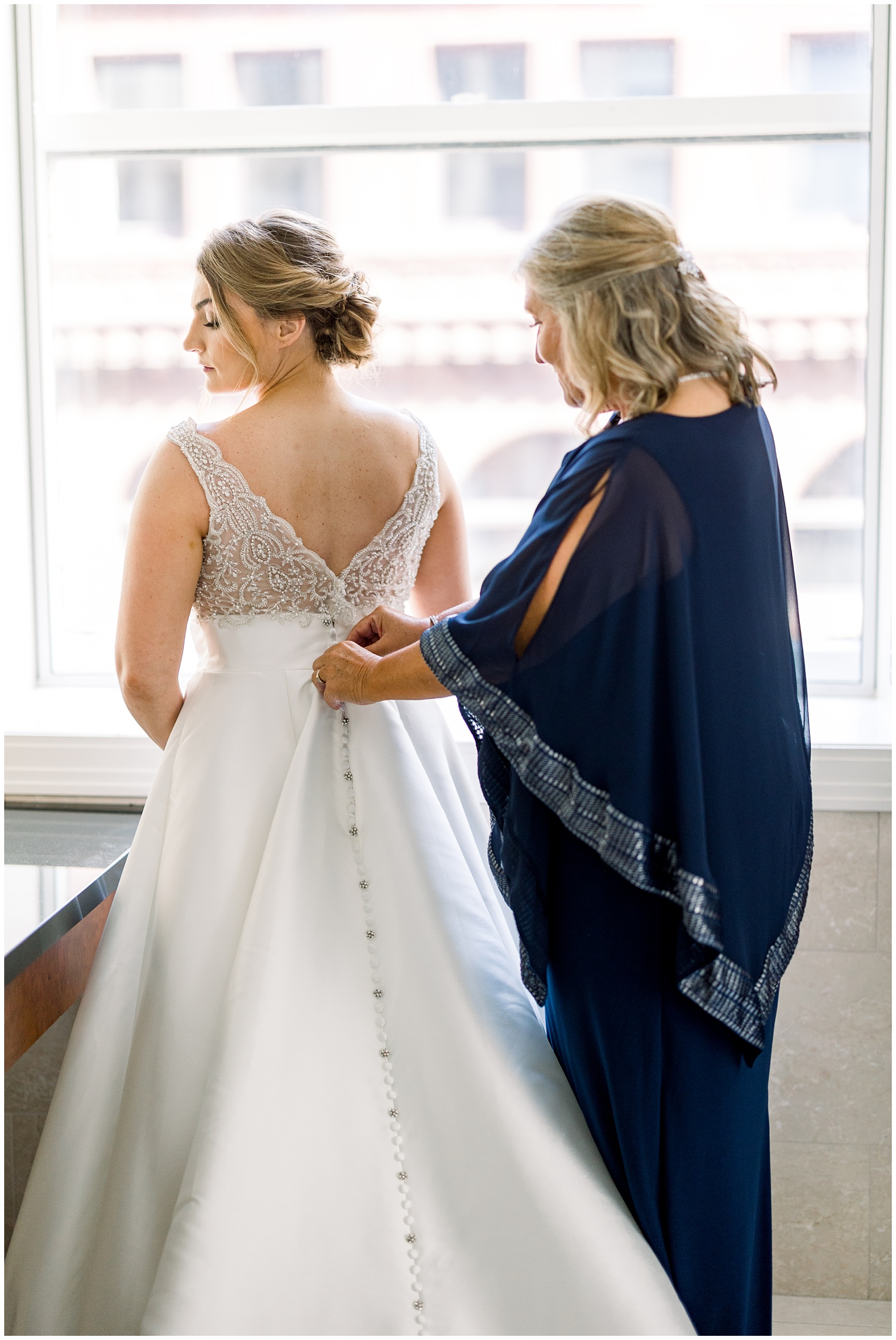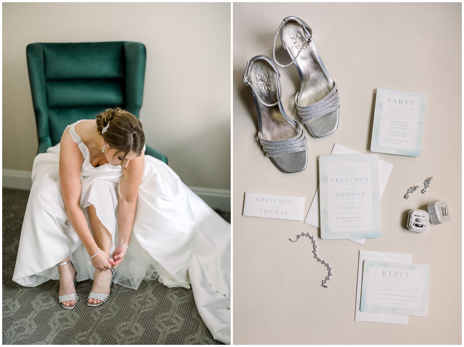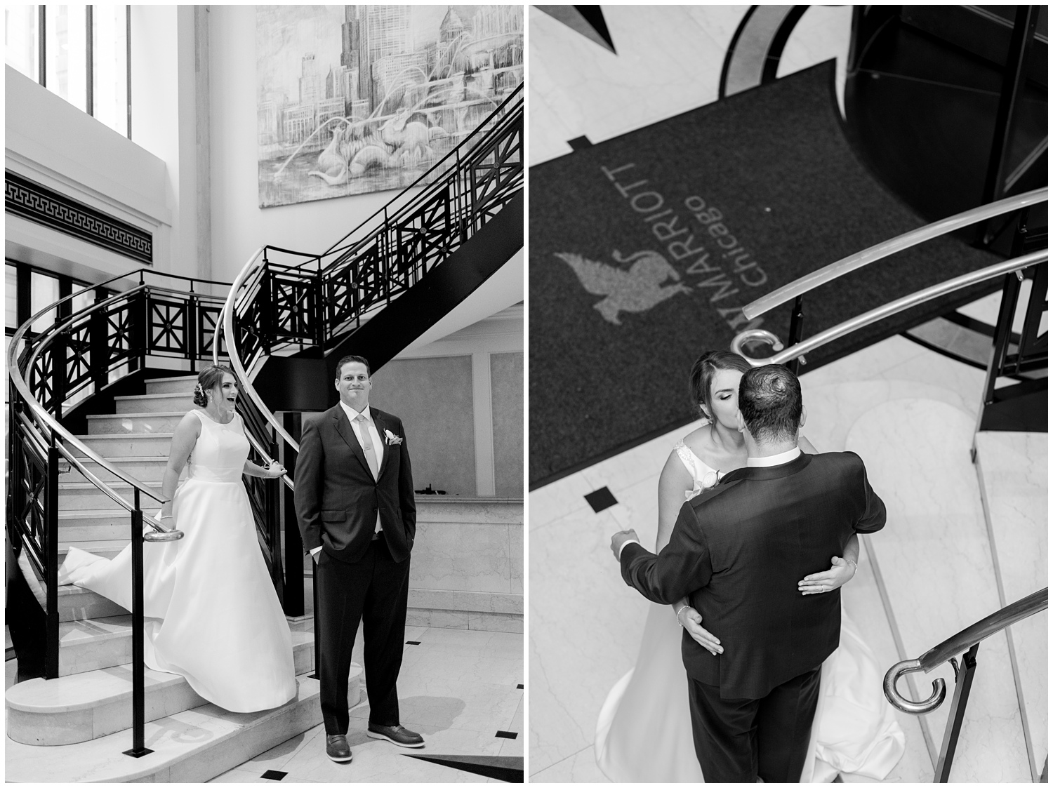 I’m so excited to share Gretchen and Tom’s wedding on the Chicago River photos at Rivers Restaurant. The day started at the JW Marriott in Chicago. This hotel is one of my favorite locations for getting ready in the West Loop because it has beautiful staircases and it’s just a few short steps to locations the Chicago Board of Trade and the Rookery. Both of those additional locations are such iconic architectural spots that they make the perfect backdrop for photos.